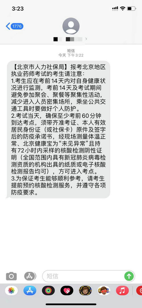 就在今天(2020年10月9日),小編收到了一條由北京市人力社保局官方發(fā)布的2021年執(zhí)業(yè)藥師考試的防疫提醒短信!報(bào)考北京市2021年執(zhí)業(yè)藥師考試的你,有收到同樣的短信嗎?