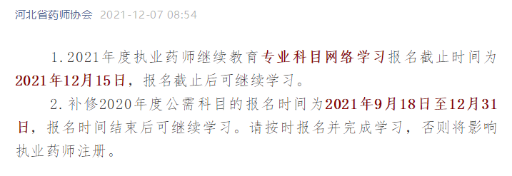 2021年度執(zhí)業(yè)藥師繼續(xù)教育專(zhuān)業(yè)科目網(wǎng)絡(luò)學(xué)習(xí)報(bào)名截止時(shí)間