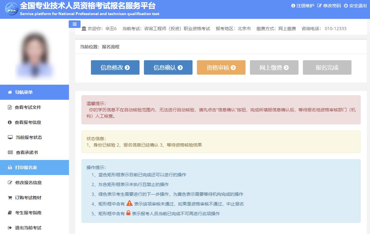 保存報(bào)名信息后,進(jìn)入報(bào)考人員狀態(tài)界面(見下圖)。