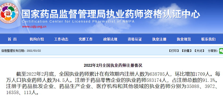 2022年3月22日,官方公布了2022年2月全國執(zhí)業(yè)藥師注冊情況,目前全國執(zhí)業(yè)藥師注冊人數(shù)約有64萬,每萬人口執(zhí)業(yè)藥師人數(shù)已達到了4.5人,詳情如下!