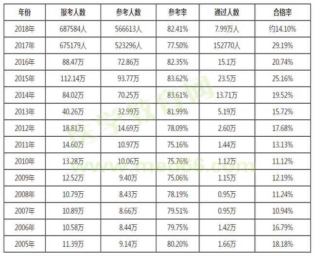 根據(jù)食品藥品監(jiān)督管理總局執(zhí)業(yè)藥師資格認(rèn)證中心網(wǎng)站發(fā)布的最新數(shù)據(jù):2018年度全國(guó)執(zhí)業(yè)藥師資格考試報(bào)考人數(shù)為687584人,實(shí)際參考人數(shù)為566613人,參考率82.41%,合格人數(shù)約為7.99萬人,合格率為14.10%。以下是近些年執(zhí)業(yè)藥師報(bào)考情況: