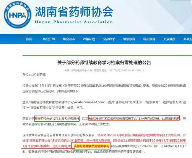 2020年1月10日,湖南藥師協(xié)會發(fā)布了一則關(guān)于部分藥師繼續(xù)教育學(xué)習(xí)檔案歸零處理的公告。這就意味著這部分藥師需要重新參加過2019年的執(zhí)業(yè)藥師繼續(xù)教育,并且及時修滿相對應(yīng)的學(xué)分。