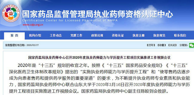 2020年3月18日,國家藥品監(jiān)督管理局執(zhí)業(yè)藥師資格認證中心發(fā)布《國家藥監(jiān)局執(zhí)業(yè)藥師中心召開2020年度執(zhí)業(yè)藥師能力與學歷提升工程項目實施推進工作視頻會議》的消息,該視頻會議主要是為了推進全國執(zhí)業(yè)藥師能力與學歷提升工程項目實施!
