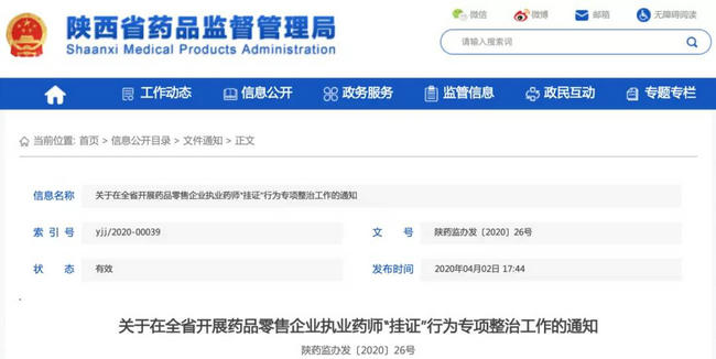 4月2日,陜西藥監(jiān)局發(fā)布了《關(guān)于在全省開(kāi)展藥品零售企業(yè)執(zhí)業(yè)藥師“掛證”行為專(zhuān)項(xiàng)整治工作的通知》,整治行動(dòng)從4月一直持續(xù)到8月。