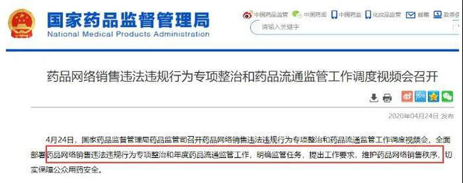 2020年4月24日,國(guó)家藥品監(jiān)督管理局藥品監(jiān)管司召開(kāi)藥品網(wǎng)絡(luò)銷售違法違規(guī)行為專項(xiàng)整治和藥品流通監(jiān)管工作調(diào)度視頻會(huì),全面部署藥品網(wǎng)絡(luò)銷售違法違規(guī)行為專項(xiàng)整治和年度藥品流通監(jiān)管工作,明確監(jiān)管任務(wù),提出工作要求,維護(hù)藥品網(wǎng)絡(luò)銷售秩序,切實(shí)保障公眾用藥安全。