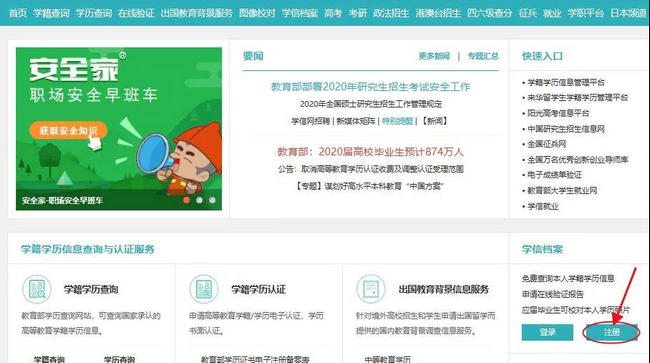 第一步:打開學信網官方網址,點擊右側的學信檔案注冊。