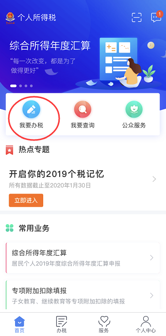 1、首先需要在應(yīng)用商店里下載“個人所得稅APP”,其次,沒有填報2019年獲得證書信息的需要先填報信息--打開個人所得稅APP--選擇我要辦稅。