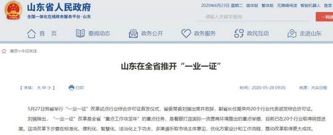 2020年5月27日,山東省“一業(yè)一證”改革將一個(gè)行業(yè)多個(gè)許可證,合并為一張綜合許可證,并將許可內(nèi)容形成二維碼,實(shí)現(xiàn)行業(yè)許可信息一碼覆蓋,平均壓減許可環(huán)節(jié)、申報(bào)材料、審批時(shí)間71%、80%、78%,審批時(shí)限由最長(zhǎng)的85天壓減至10天,有的當(dāng)天即可辦結(jié)。