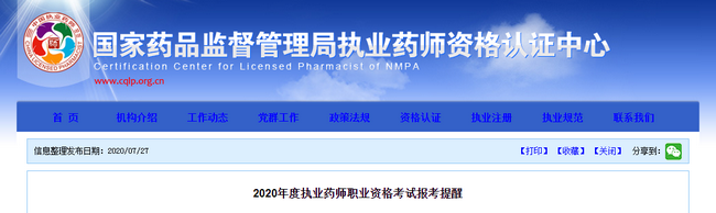 國(guó)家藥品監(jiān)督管理局執(zhí)業(yè)藥師資格認(rèn)證中心發(fā)布了《2020年度執(zhí)業(yè)藥師職業(yè)資格考試報(bào)考提醒》,具體內(nèi)容如下: