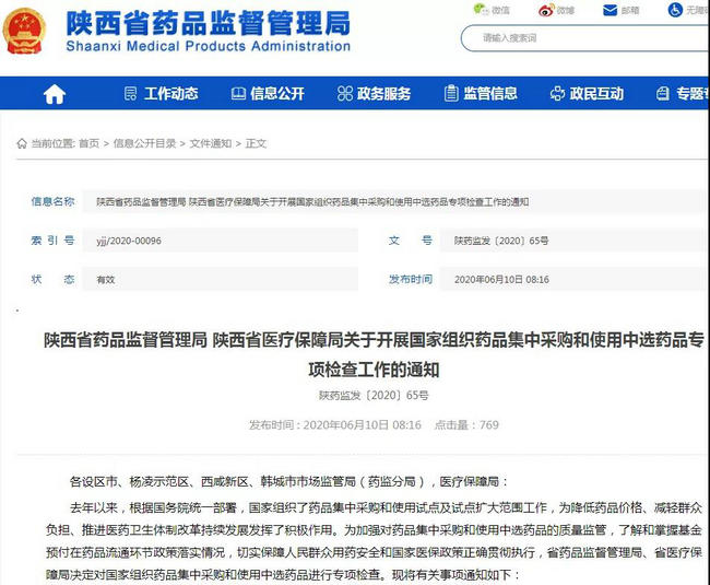 近日,陜西省藥品監(jiān)督管理局、陜西省醫(yī)療保障局發(fā)布了《關(guān)于開展國家組織藥品集中采購和使用中選藥品專項(xiàng)檢查工作的通知》,詳情如下: