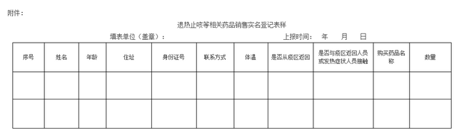 其中尤其提到,零售藥店對(duì)每日購(gòu)買退熱、止咳、抗病毒、抗菌素等藥品的人員,必須全部進(jìn)行實(shí)名信息登記(登記表樣如下)。