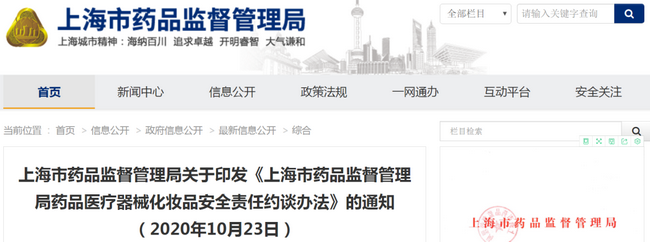 為進一步強化藥品、醫(yī)療器械、化妝品安全監(jiān)管,落實企業(yè)主體責(zé)任,提升監(jiān)管效能,控制和預(yù)防藥品、醫(yī)療器械、化妝品違法行為和安全事件,切實保障公眾健康,上海市藥監(jiān)局制定了《上海市藥品監(jiān)督管理局藥品醫(yī)療器械化妝品安全責(zé)任約談辦法》。