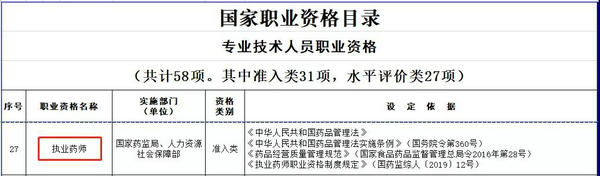 其中執(zhí)業(yè)藥師依然穩(wěn)居在準(zhǔn)入類第27項(xiàng),是需要考試拿證才能從事的職業(yè)崗位。