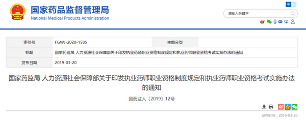 2019年3月20日,國家藥監(jiān)局,人力資源社會保障部發(fā)布了《關于執(zhí)業(yè)藥師職業(yè)資格制度規(guī)定和執(zhí)業(yè)藥師職業(yè)資格考試實施辦法的通知》。