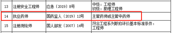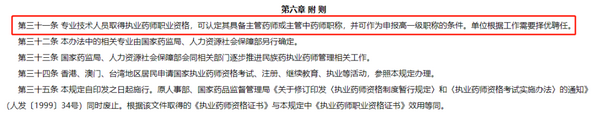 其中第六章第三十一條明確:專業(yè)技術人員取得執(zhí)業(yè)藥師職業(yè)資格,可認定其具備主管藥師或主管中藥師職稱,并可作為申報高一級職稱的條件。單位根據(jù)工作需要擇優(yōu)聘任。