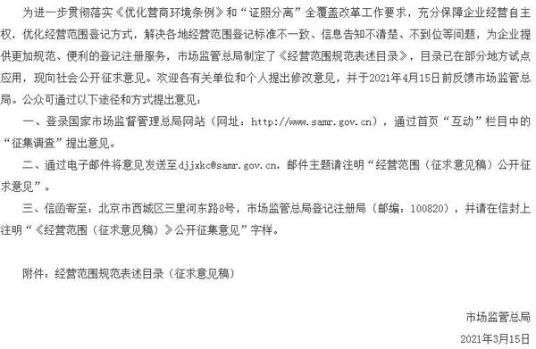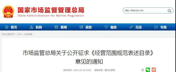 近日,市場(chǎng)監(jiān)督管理總局發(fā)布了關(guān)于公開征求《經(jīng)營(yíng)范圍規(guī)范表述目錄》意見的通知,詳情如下: