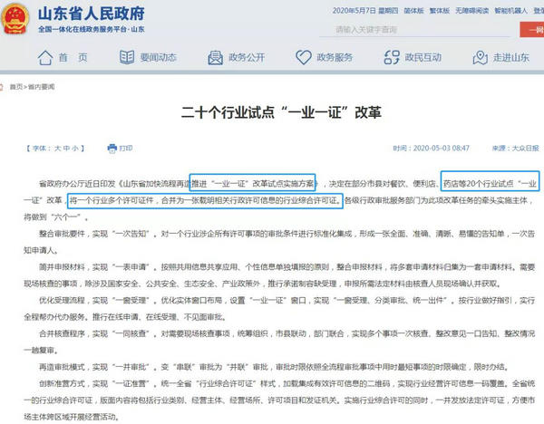 往日山東省政府辦公廳印發(fā)《山東省加快流程再造推進(jìn)“一業(yè)一證”改革試點(diǎn)實(shí)施方案》,以下簡(jiǎn)稱方案,方案決定在部分市縣對(duì)餐飲、便利店、藥店等20個(gè)行業(yè)試點(diǎn)“一業(yè)一證”改革,將一個(gè)行業(yè)多個(gè)許可證件,合并為一張載明相關(guān)行政許可信息的行業(yè)綜合許可證。