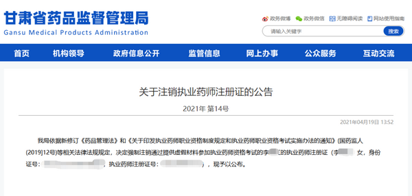 4月19日,甘肅藥監(jiān)局發(fā)布了《關(guān)于注銷執(zhí)業(yè)藥師注冊證的公告》(以下簡稱《公告》)。