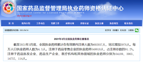 根據(jù)國(guó)家藥監(jiān)局執(zhí)業(yè)藥師認(rèn)證中心最新數(shù)據(jù)顯示,截至2021年3月底,全國(guó)執(zhí)業(yè)藥師累計(jì)在有效期內(nèi)注冊(cè)人數(shù)為602037人,環(huán)比增加5978人。每萬(wàn)人口執(zhí)業(yè)藥師人數(shù)為4.3人。