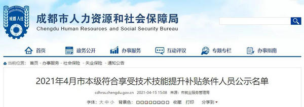 近日,成都市人力資源和社會(huì)保障局下發(fā)了2021年4月份本級(jí)符合技術(shù)技能提升補(bǔ)貼條件人員公示名單,共有576人獲得補(bǔ)貼,其中有20名執(zhí)業(yè)藥師包含在內(nèi)。