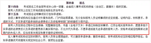 人社廳發(fā)〔2021〕18號:報(bào)考人員在報(bào)名過程中應(yīng)當(dāng)準(zhǔn)確、完整填報(bào)信息,書面(含電子文本)承諾已知曉告知事項(xiàng)、已符合相關(guān)報(bào)考條件、愿意承擔(dān)不實(shí)承諾的法律責(zé)任以及承諾的意思表示真實(shí)等內(nèi)容,不允許代為承諾。不愿承諾或者無法承諾的報(bào)考人員、資格考試誠信檔案庫記錄期內(nèi)的失信人員,應(yīng)當(dāng)依有關(guān)規(guī)定和要求提供證明材料。