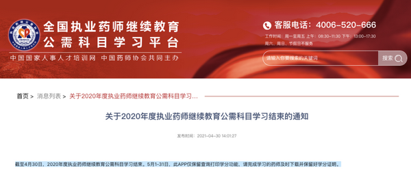 根據(jù)中國藥師協(xié)會日前發(fā)布的通知:截至4月30日,2020年度執(zhí)業(yè)藥師繼續(xù)教育公需科目學習結(jié)束。5月1-31日,執(zhí)業(yè)藥師繼續(xù)教育公需科目學習平臺和APP均僅保留查詢打印學分功能,請完成學習的執(zhí)業(yè)藥師及時去平臺下載并保留好學分證明,以免錯失影響注冊。