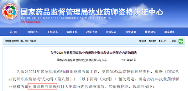 國家藥監(jiān)局執(zhí)業(yè)藥師中心日前發(fā)布的法規(guī)考綱調(diào)整通告,具體內(nèi)容如下所示: