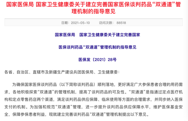 國(guó)家醫(yī)保局、國(guó)家衛(wèi)健委發(fā)布《關(guān)于建立完善國(guó)家醫(yī)保談判藥品“雙通道”管理機(jī)制的指導(dǎo)意見》(以下簡(jiǎn)稱《指導(dǎo)意見》),通過定點(diǎn)醫(yī)療機(jī)構(gòu)和定點(diǎn)零售藥店兩個(gè)渠道,滿足談判藥品供應(yīng)保障、臨床使用等方面的合理需求,并同步納入醫(yī)保支付的機(jī)制。