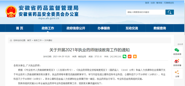 4月29日,安徽省藥品監(jiān)督管理局發(fā)布《關(guān)于開展2021年執(zhí)業(yè)藥師繼續(xù)教育工作的通知》(簡(jiǎn)稱“《通知》”),要求執(zhí)業(yè)藥師每年需完成繼續(xù)教育學(xué)習(xí),學(xué)習(xí)內(nèi)容包括公需科目和專業(yè)科目,公需科目不少于30學(xué)時(shí)(10學(xué)分),專業(yè)科目不少于60學(xué)時(shí)(20學(xué)分)。