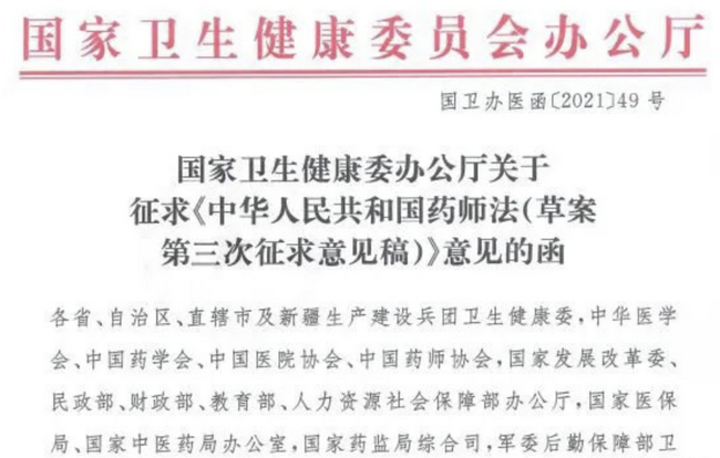 第一征求意見稿為2017年版本。由教育部、人力資源社會保障部、國家衛(wèi)生健康委、國家中醫(yī)藥局、軍委后勤保障部衛(wèi)生局等部門有關(guān)負(fù)責(zé)同志或?qū)<医M成《藥師法》起草專家組。起草形成了《藥師法(草案征求意見稿)》第一征求意見稿。