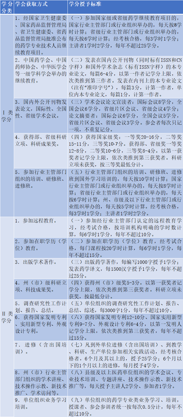 《細則》規(guī)定,藥學專業(yè)技術人員繼續(xù)教育學分分為Ⅰ類學分和Ⅱ類學分兩類。藥學專業(yè)技術人員每年須參加繼續(xù)教育,所獲得的學分不低于25分,其中,Ⅰ類學分不少于5分。