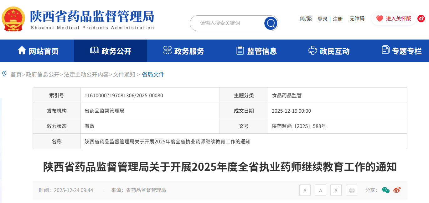 【陜西】關(guān)于開展2025年度全省執(zhí)業(yè)藥師繼續(xù)教育工作