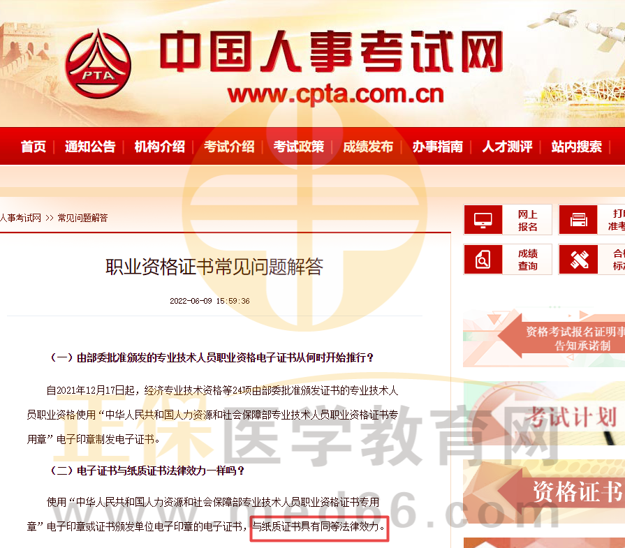 使用“中華人民共和國人力資源和社會保障部專業(yè)技術(shù)人員職業(yè)資格證書專用章”電子印章或證書頒發(fā)單位電子印章的電子證書,與紙質(zhì)證書具有同等法律效力,如有著急使用資格證書的考生,可先下載電子證書。