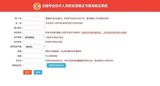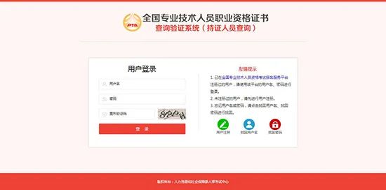 全國專業(yè)技術(shù)人員職業(yè)資格證書查詢驗證系統(tǒng)與全國專業(yè)技術(shù)人員資格考試報名服務(wù)平臺共享注冊信息,已在全國專業(yè)技術(shù)人員資格考試報名服務(wù)平臺注冊過的用戶,請使用該平臺的用戶名、密碼登錄證書查詢驗證系統(tǒng)。