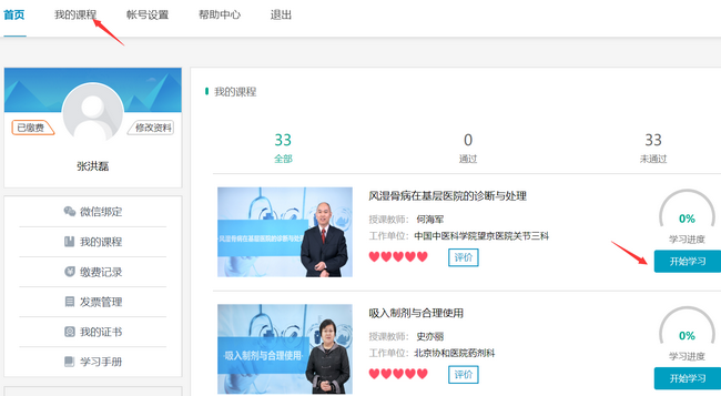 1、在“我的課程”頁面,選擇某個課程學習,點擊開始學習,學習課程。觀看課程時不允許快進。