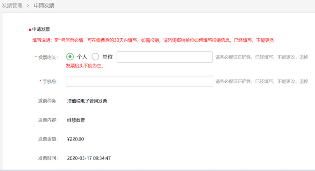 3、填寫相關發(fā)票信息,個人和單位二選一,填寫完成后提交。