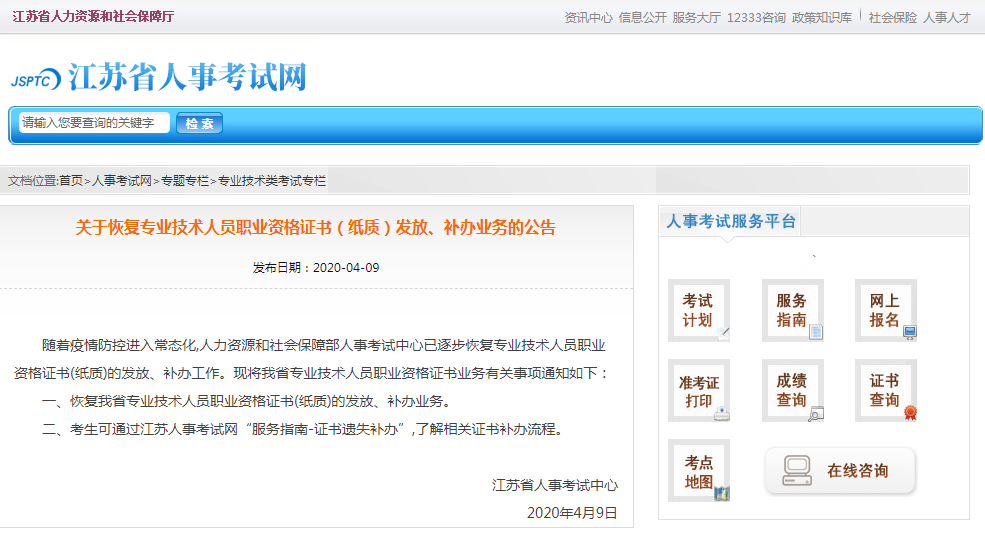 二、考生可通過江蘇人事考試網(wǎng)“服務(wù)指南-證書遺失補(bǔ)辦”,了解相關(guān)證書補(bǔ)辦流程。