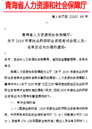 【青海】2019年執(zhí)業(yè)藥師考試合格人員名單及證書辦理的通知