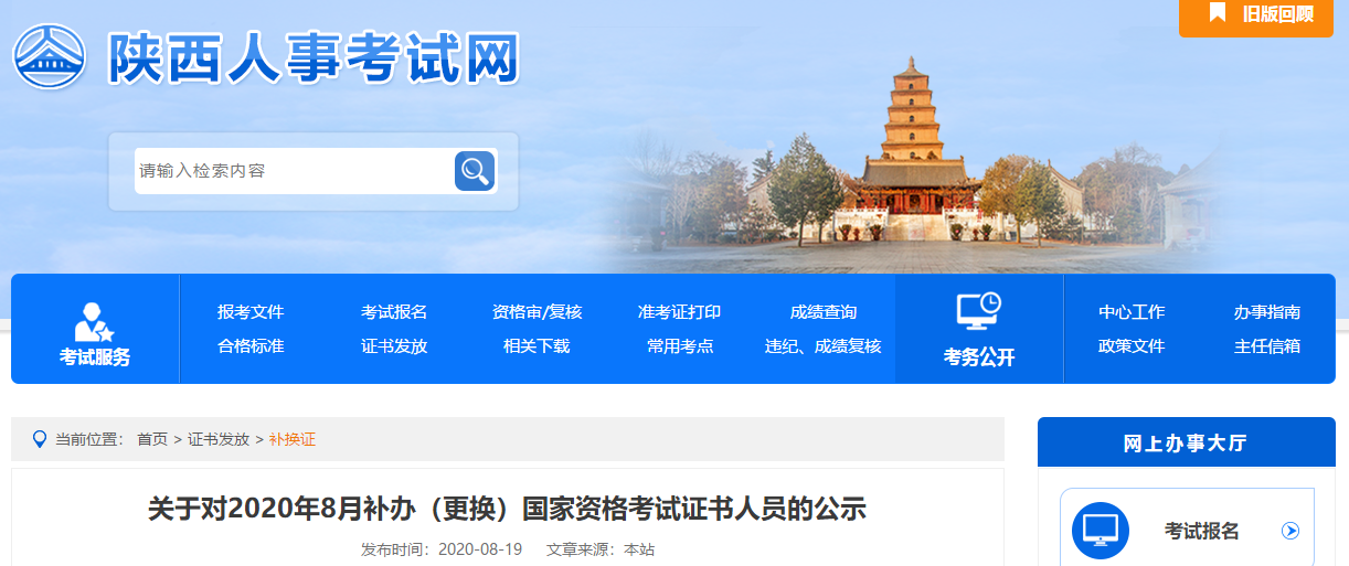 2020年8月需要補辦(更換)的證書資料公示期滿后送人社部人事考試中心,待補辦證書發(fā)放至我省后,我們將及時組織發(fā)放,請關(guān)注陜西省人事考試中心官網(wǎng)或公眾微信號sxrskswx,及時獲取辦證資訊。