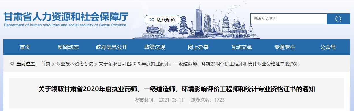 關(guān)于領(lǐng)取甘肅省2020年度執(zhí)業(yè)藥師、一級建造師、環(huán)境影響評價工程師和統(tǒng)計專業(yè)資格證書的通知