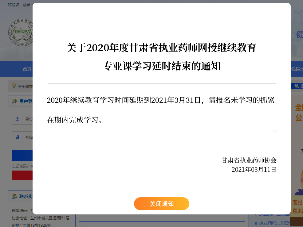關于2020年度甘肅省執(zhí)業(yè)藥師網(wǎng)授繼續(xù)教育專業(yè)課學習延時結束的通知