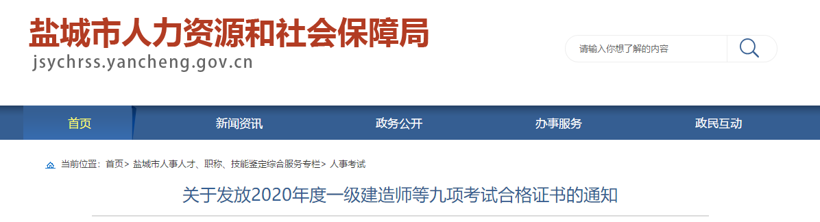 根據國家和省統(tǒng)一安排,鹽城考區(qū)2020年度一級建造師資格考試、社會工作者職業(yè)水平考試、翻譯專業(yè)資格(水平)考試、注冊計量師職業(yè)資格考試、統(tǒng)計專業(yè)技術資格考試、中級注冊安全工程師職業(yè)資格考試、執(zhí)業(yè)藥師職業(yè)資格考試、環(huán)境影響評價工程師職業(yè)資格考試、審計專業(yè)技術資格考試(初、中級)合格證書定于2021年4月12日開始發(fā)放。