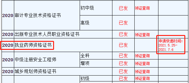 根據(jù)浙江人事考試網(wǎng)《資格證書領(lǐng)取時間安排表》來看,2020年執(zhí)業(yè)藥師證書已發(fā),申請郵寄時間為5月25日——7月6日,詳情如下!