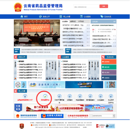 1.打開云南省藥品監(jiān)督管理局網(wǎng)站(http://mpa.yn.gov.cn/),選擇藥品監(jiān)管平臺: