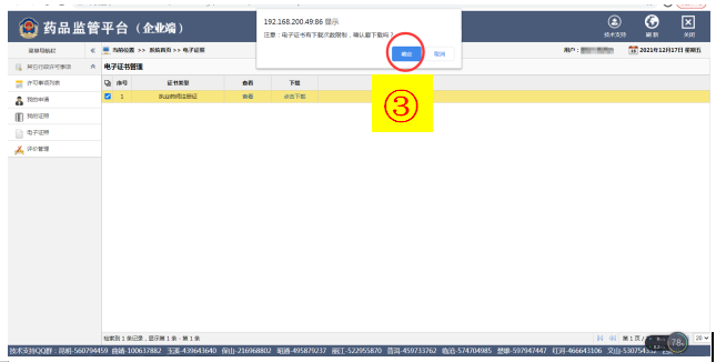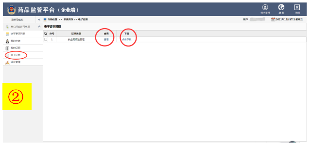 4.選擇“電子證照”,點(diǎn)擊“查看”、“下載”即可查看執(zhí)業(yè)藥師注冊證電子證照信息或下載執(zhí)業(yè)藥師注冊證電子證照,需打印紙質(zhì)證書的選擇“點(diǎn)擊下載”,按系統(tǒng)提示,點(diǎn)擊確定→點(diǎn)此下載電子證書→下載或打印完成執(zhí)業(yè)藥師注冊證電子證照下載打?。?/p>