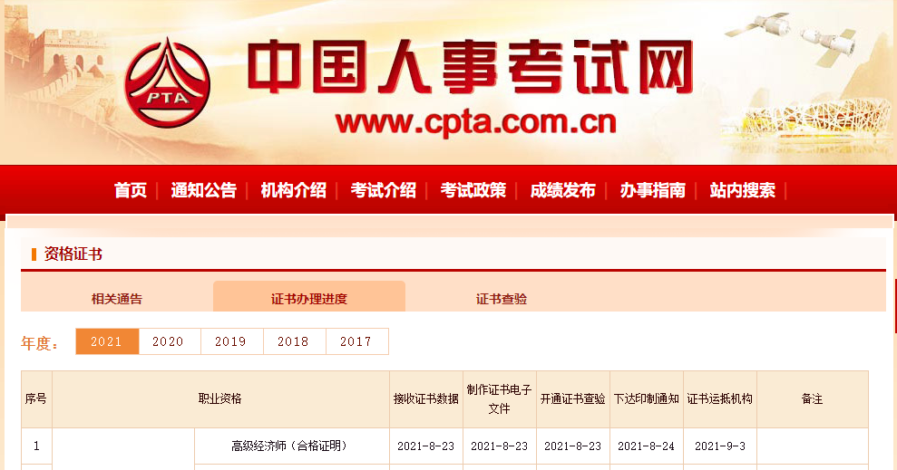 中國(guó)人事考試網(wǎng)(http://www.cpta.com.cn/index.html)→證書查驗(yàn)→證書辦理進(jìn)度