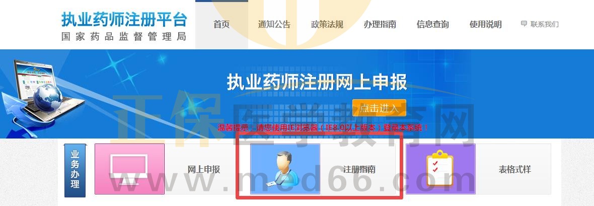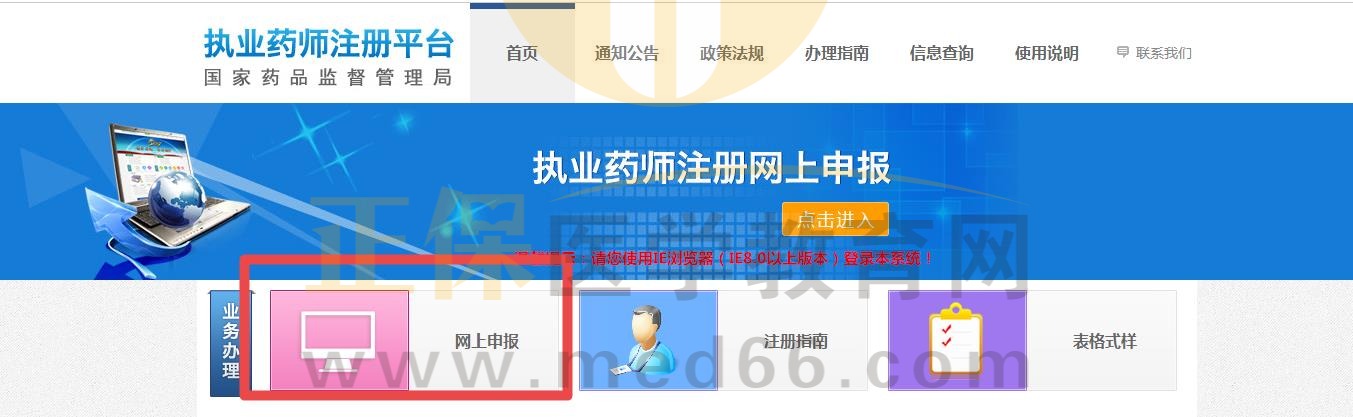 網(wǎng)上申報的入口有兩個:一個是網(wǎng)站標(biāo)題下面的“執(zhí)業(yè)藥師注冊網(wǎng)上申報”的“點(diǎn)擊進(jìn)入”按鈕,一個是網(wǎng)頁“業(yè)務(wù)辦理”欄的網(wǎng)上申報,如圖: