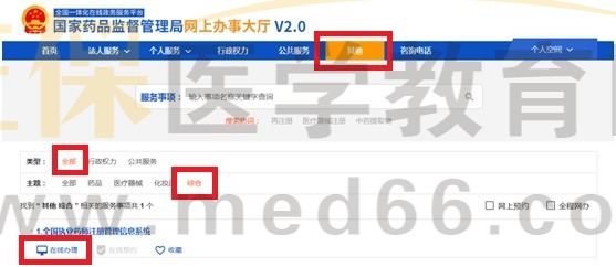 2、登錄后在標(biāo)題欄中單擊“其他”,在“主題”項目中選“綜合”,再選擇“全國執(zhí)業(yè)藥師注冊管理信息系統(tǒng)”的“在線辦理”。