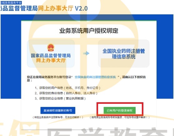 3、首次辦理執(zhí)業(yè)藥師注冊用戶,進(jìn)行業(yè)務(wù)系統(tǒng)用戶授權(quán)綁定,選擇“已有用戶的登錄授權(quán)”?!坝脩裘陛斎雵宜幤繁O(jiān)督管理局執(zhí)業(yè)藥師注冊平臺中證件號碼(報考執(zhí)業(yè)藥師身份證件號碼),密碼默認(rèn)無需輸入,輸入驗(yàn)證碼,登錄。驗(yàn)證成功即賬號綁定了“全國執(zhí)業(yè)藥師注冊管理信息系統(tǒng)”,下次選擇“全國執(zhí)業(yè)藥師注冊管理信息系統(tǒng)在線辦理”即可直接進(jìn)入執(zhí)業(yè)藥師注冊頁面,選擇注冊省份和注冊辦理模式進(jìn)行個人注冊申報。
