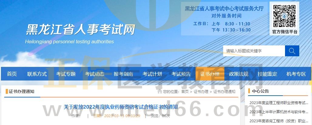 黑龍江關(guān)于發(fā)放2022年度執(zhí)業(yè)藥師資格考試合格證書的通知